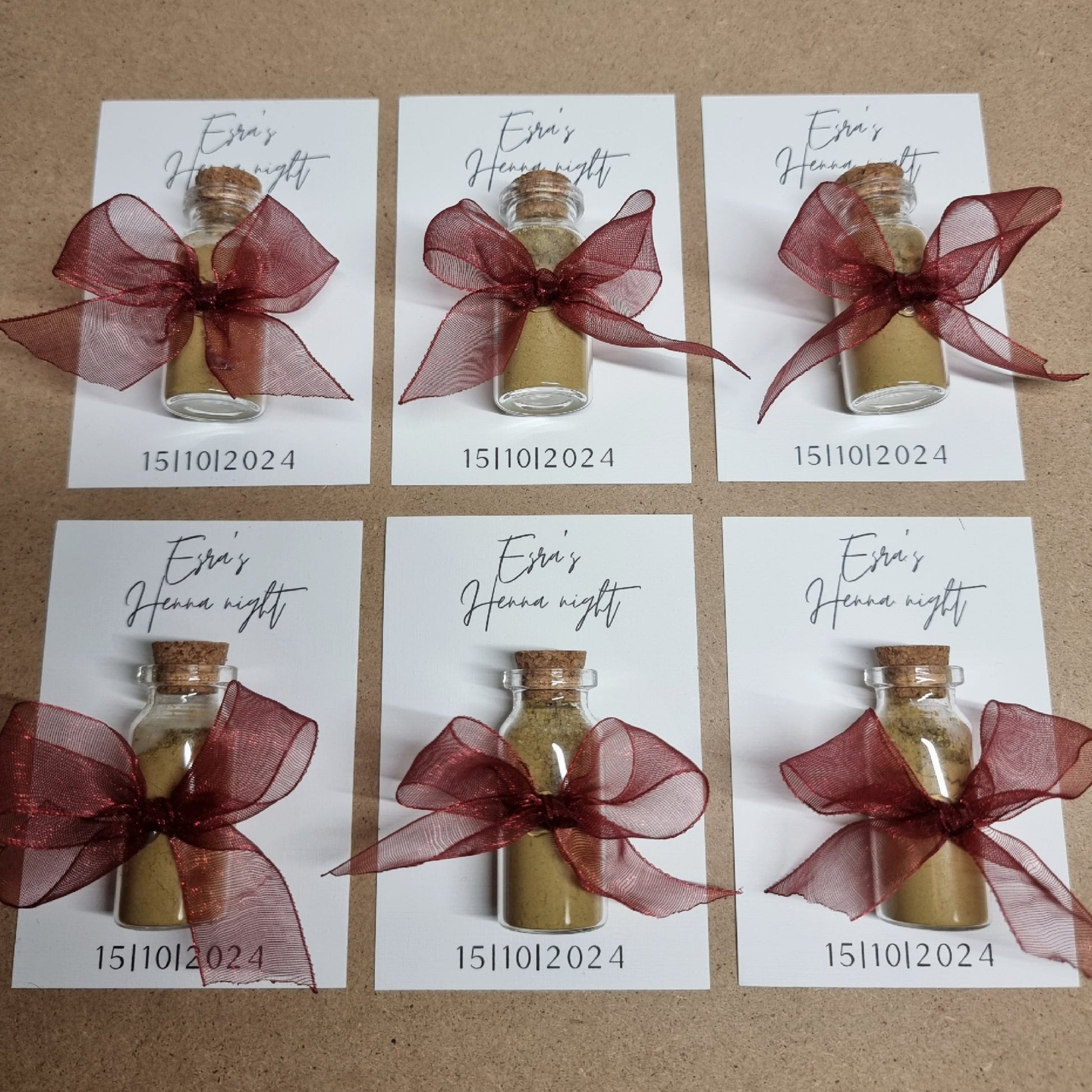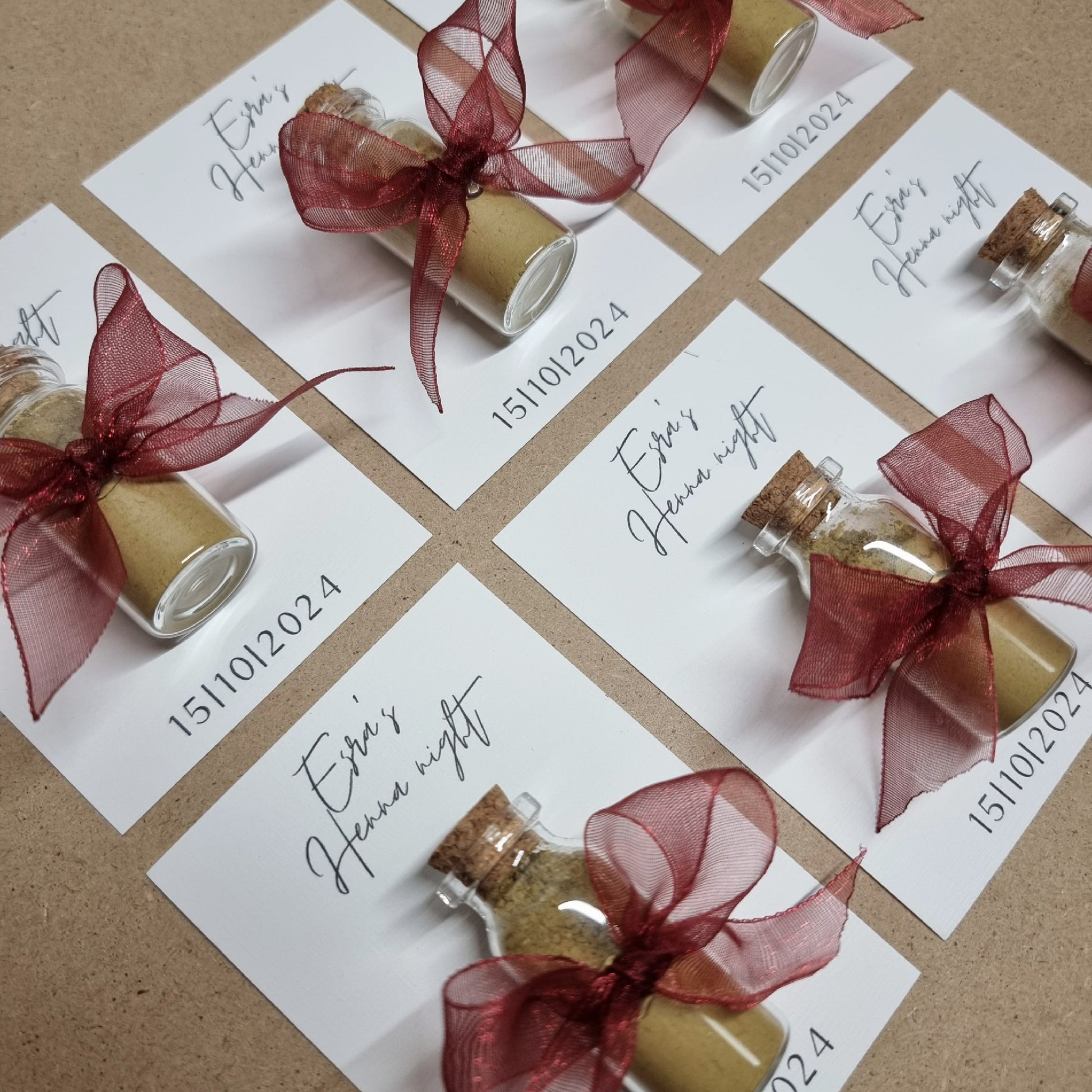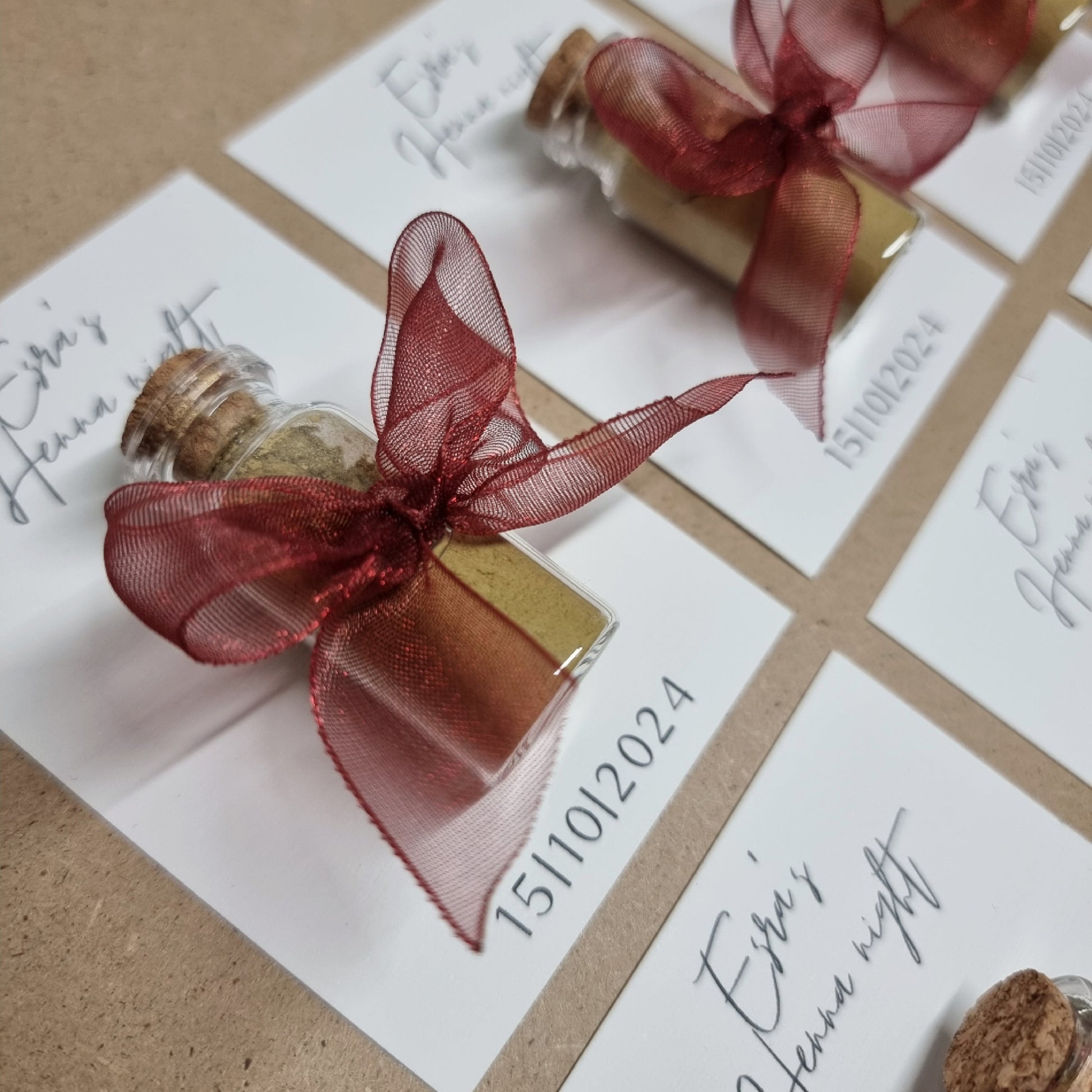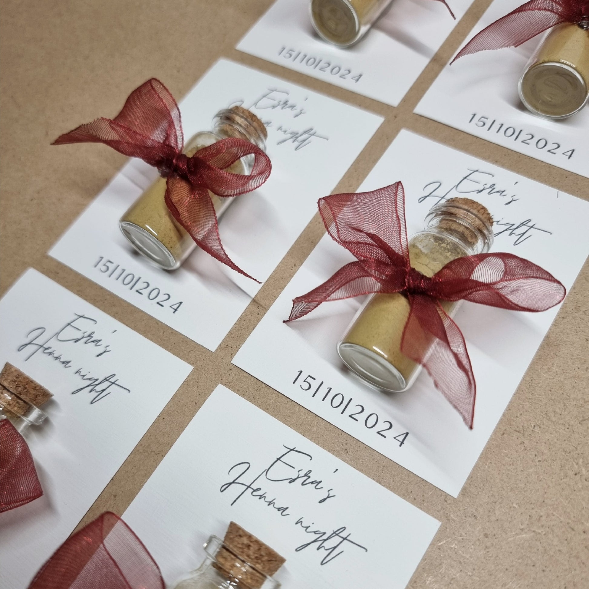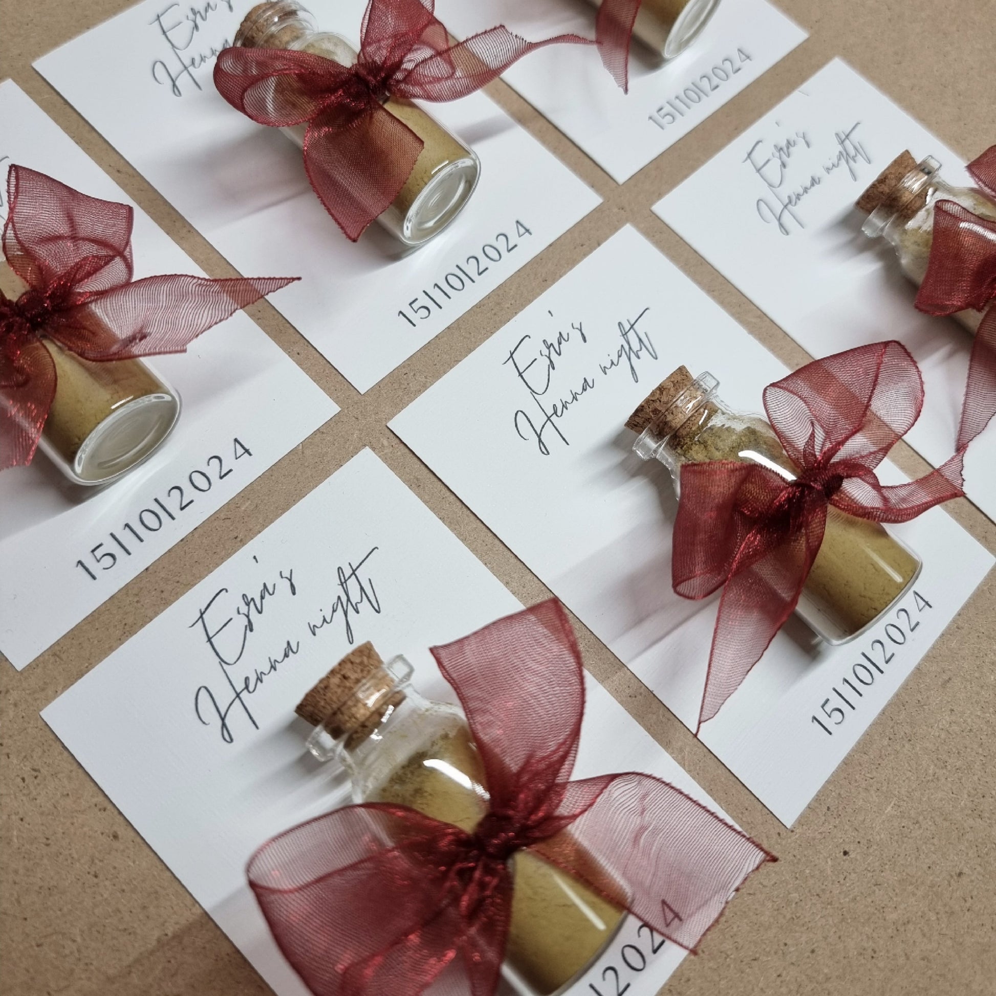 Geef je gasten een prachtig aandenken aan je henna-feestje met onze stijlvolle henna bedankjes! Elk bedankje is met zorg gemaakt en afgewerkt met een elegante organza chiffon strik, beschikbaar in meerdere kleuren naar keuze. Deze luxe bedankjes vormen een prachtige toevoeging aan je feest en zijn een mooie manier om je waardering te tonen aan familie en vrienden die je speciale dag komen vieren.