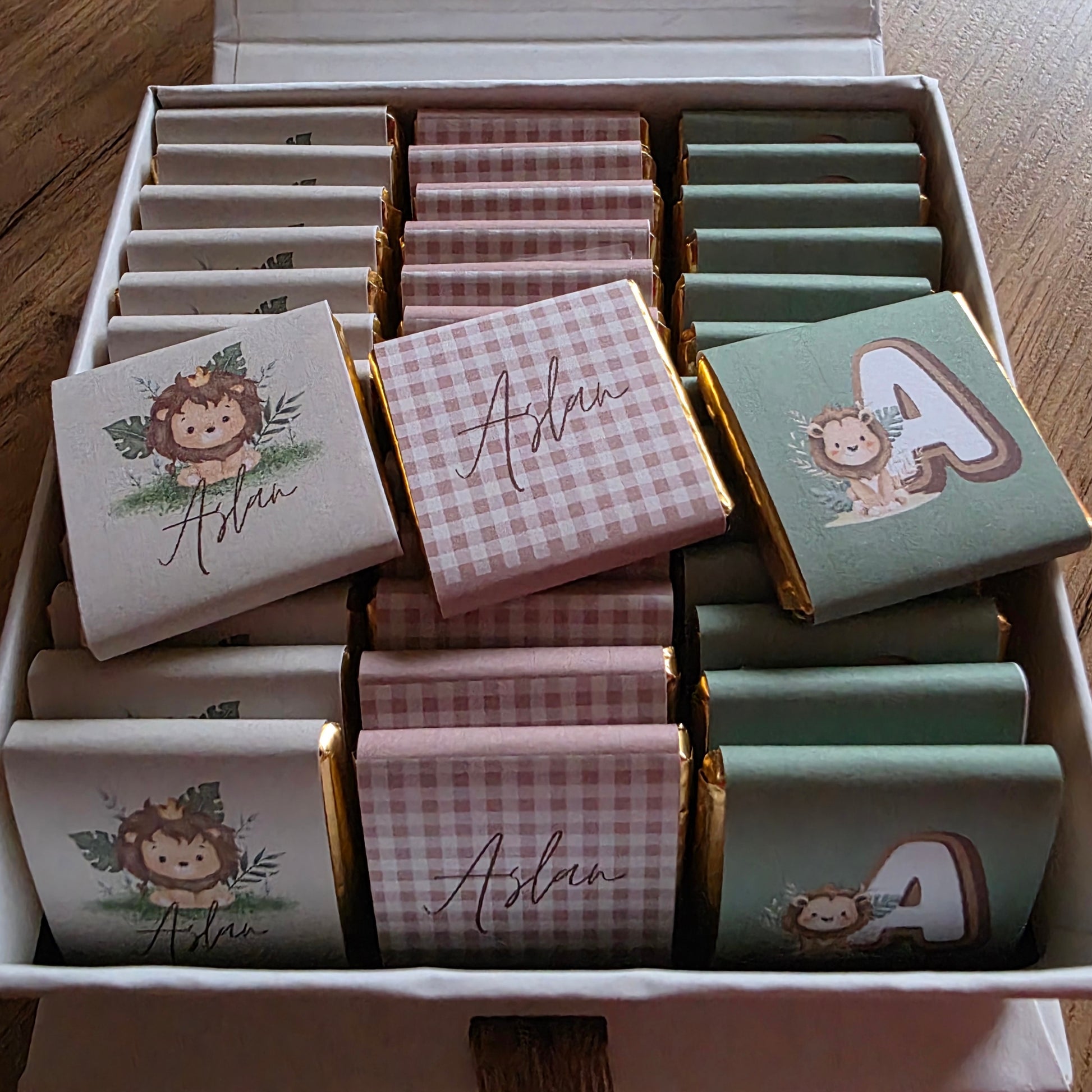 Wat deze chocobox extra bijzonder maakt, is de persoonlijke afwerking. Op het doosje plaatsen wij de naam van de ontvanger, zorgvuldig samengesteld met houten letters. Dit geeft elk boxje een warme, natuurlijke en handgemaakte look.