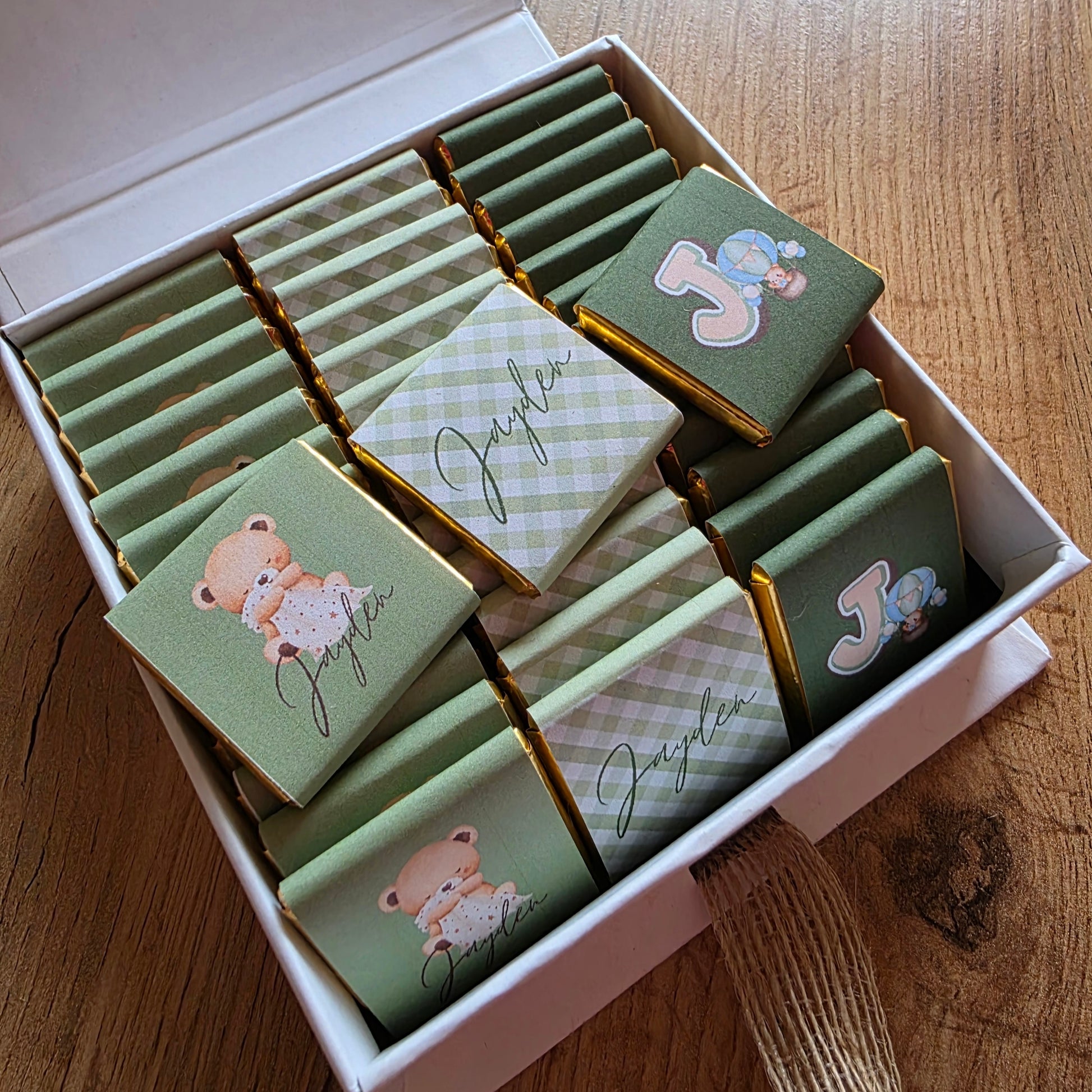 Wat deze chocobox extra bijzonder maakt, is de persoonlijke afwerking. Op het doosje plaatsen wij de naam van de ontvanger, zorgvuldig samengesteld met houten letters. Dit geeft elk boxje een warme, natuurlijke en handgemaakte look.
