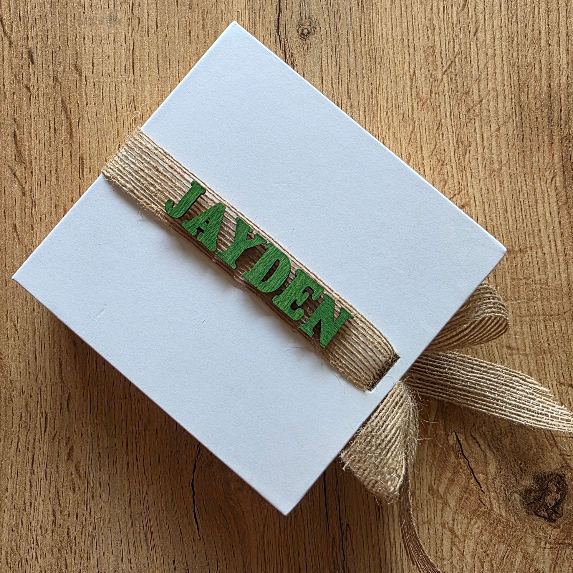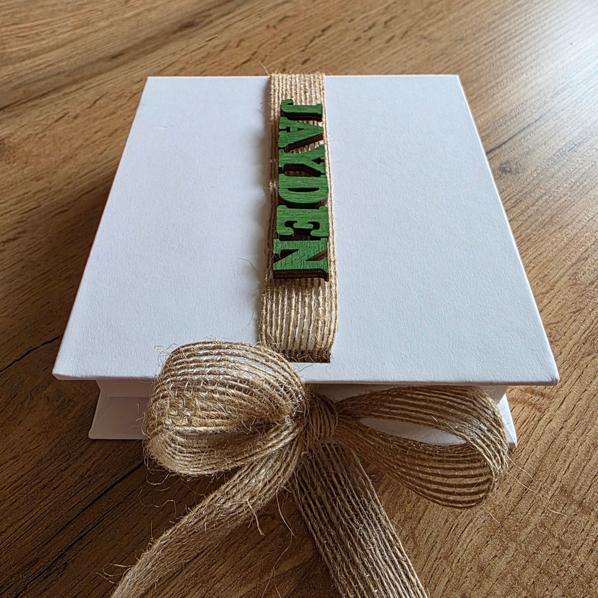 Kartonnen box, jute lint, houten letters