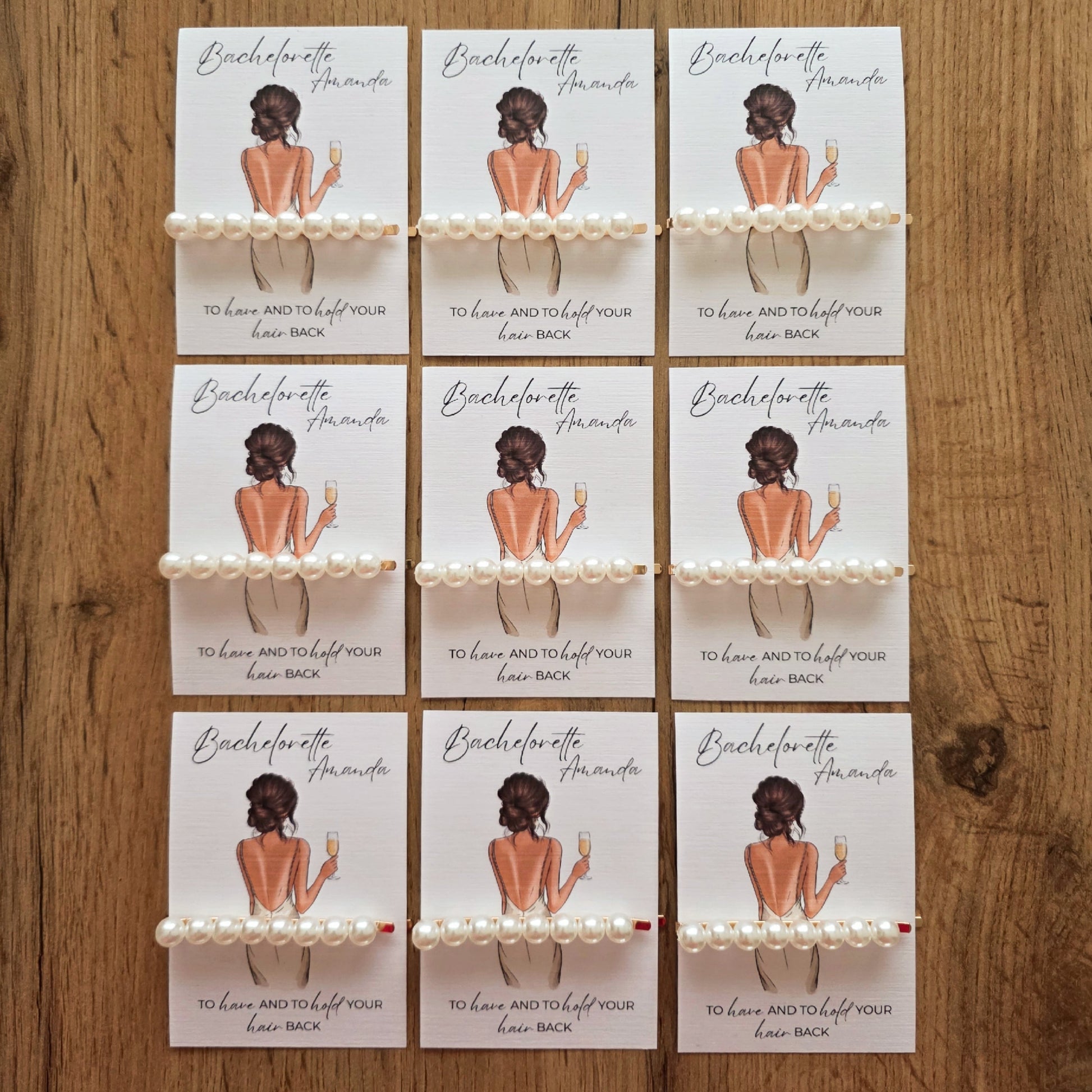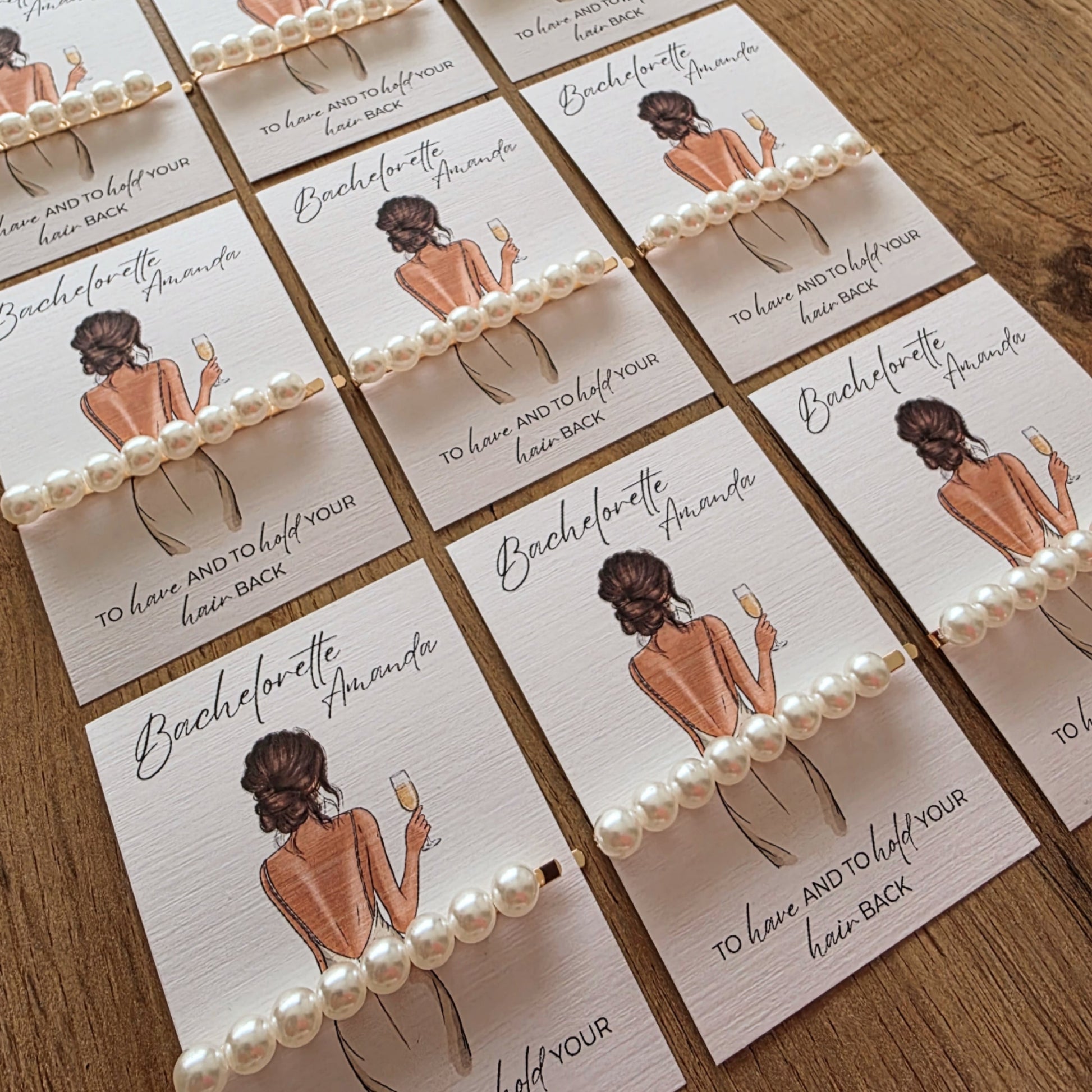 Elke hairclip is bevestigd op een elegante kaart met een verfijnde illustratie, waardoor het geheel een luxe en persoonlijke uitstraling krijgt. Ideaal om uit te delen tijdens het feestje, bij de goodiebags of als tafeldecoratie.